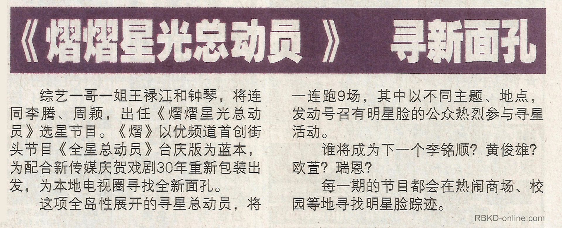 综艺一哥一å§çŽ‹ç¦„æ±Ÿå’Œé’Ÿç´ï¼Œå°†è¿žåŒæŽè…¾ã€å‘¨é¢–ï¼Œå‡ºä»»ã€Šç† ç† æ˜Ÿå…‰æ€»åŠ¨å‘˜ã€‹é€‰æ˜ŸèŠ‚ç›®ã€‚ ã€Šç† ã€‹ä»¥ä¼˜é¢‘é“首创街头节目《全星总动员》å°åº†ç‰ˆä¸ºè“本,为é…åˆæ–°ä¼ 媒庆贺æˆå‰§30年釿–°åŒ…装出å‘ï¼Œä¸ºæ–°åŠ å¡ç”µè§†åœˆå¯»æ‰¾å…¨æ–°é¢å”。