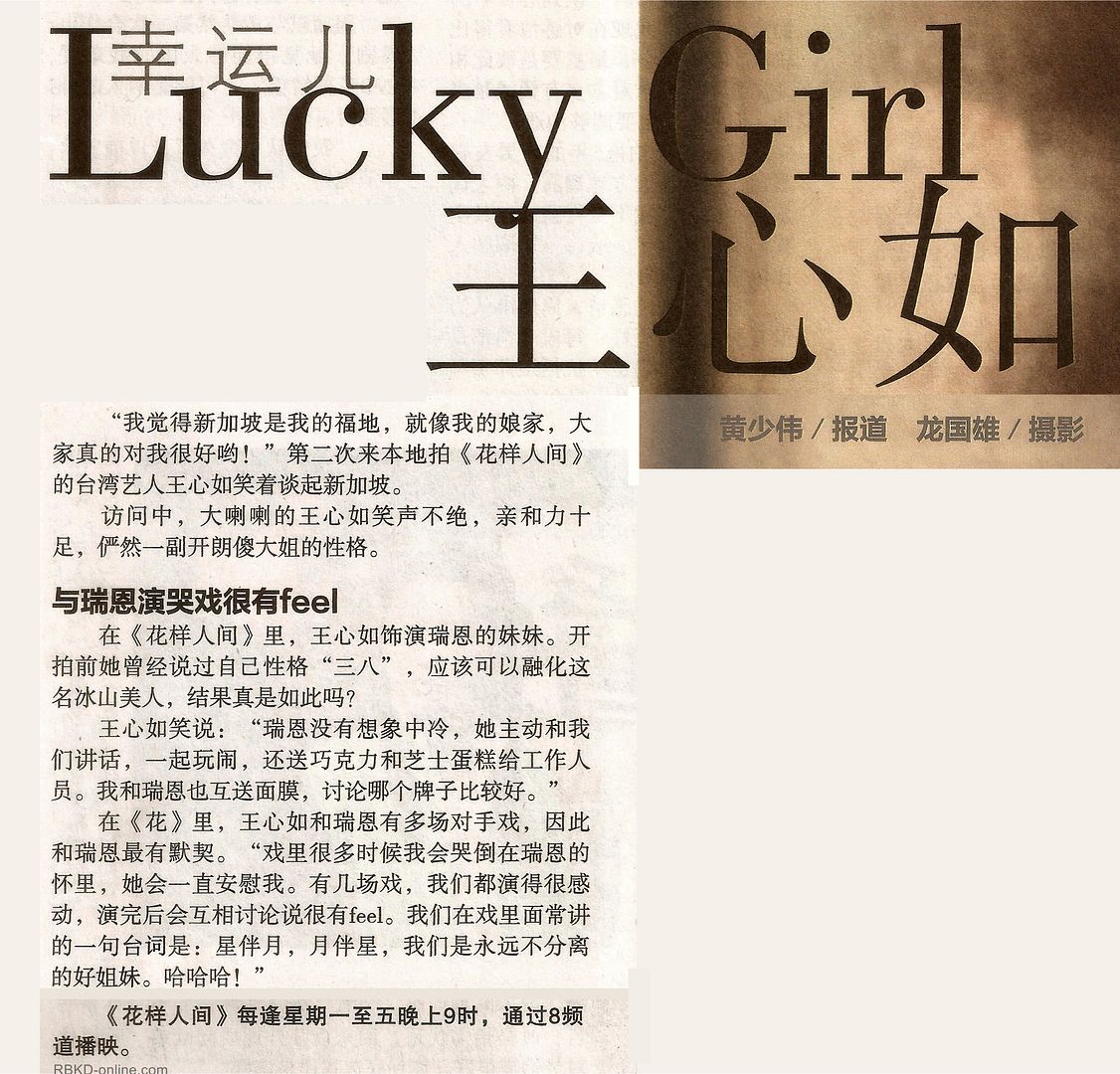 åœ¨ã€ŠèŠ±ã€‹é‡Œï¼ŒçŽ‹å¿ƒå¦‚å’Œç‘žæ©æœ‰å¤šåœºå¯¹æ‰‹æˆï¼Œå› æ¤å’Œç‘žæ©æœ€æœ‰é»˜å¥‘。“æˆé‡Œå¾ˆå¤šæ—¶å€™æˆ‘会å“倒在瑞æ©çš„æ€€é‡Œï¼Œå¥¹ä¼šä¸€ç›´å®‰æ…°æˆ‘ã€‚æœ‰å‡ åœºæˆï¼Œæˆ‘们都演得很感动,演完åŽä¼šäº’相讨论说很有feel。我们在æˆé‡Œé¢å¸¸è®²çš„一å¥å°è¯æ˜¯ï¼šæ˜Ÿä¼´æœˆï¼Œæœˆä¼´æ˜Ÿï¼Œæˆ‘们是永远ä¸åˆ†ç¦»çš„好å§å¦¹ã€‚哈哈哈ï¼â€