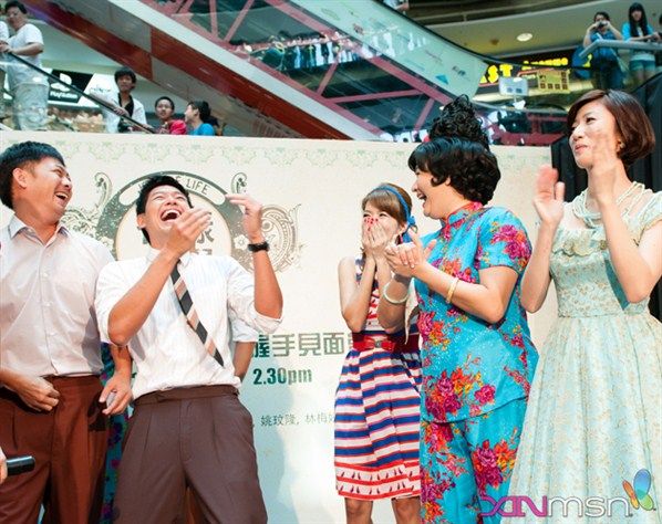 With the nostalgic TV series, Joys of Life, set to debut next week, the show’s actors such as Chen Liping, Rui En, Zheng Geping, Chew Chor Meng, Alien Huang, Cynthia Wang and more, recently reached out to the heartlands to promote their upcoming show. Styled in belted retro frocks with matching headbands and suspender suits, check out more photos — kindly provided by Rui En’s fanclub, RBKD — from the event here!