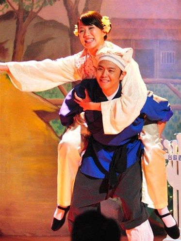 Cynthia Wang and Rui En laughing at each others’ mistakes during the filming of a getai scene in “Joys Of Life”.