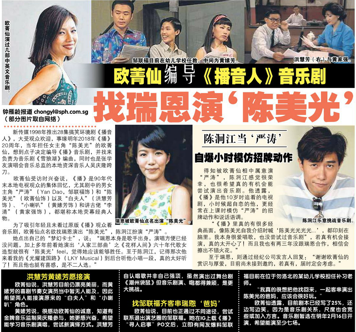 æžç¬‘情景剧《æ’》20年剿’出时,大å—观众欢迎,事缘明年2018年《æ’》20周年,当年担任女主角“程美光â€çš„æ¬§è仙,想到点å决定编导《æ’》音ä¹å‰§ï¼Œå¹¶æ‰¾æ¥è´Ÿè´£ä¸ºéŸ³ä¹å‰§ã€Šé›ªç‹¼æ¹–ã€‹ç¼–æ›²ï¼ŒåŒæ—¶ä¹Ÿæ˜¯å¼ å¦å‹æ¼”å”±ä¼šéŸ³ä¹æ€»ç›‘的本地资深音ä¹äººå´åº†éš†è·¨åˆ€ã€‚