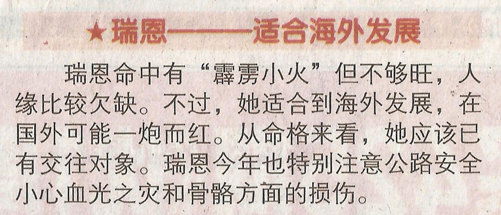 瑞æ©å‘½ä¸æœ‰â€œéœ¹é›³å°ç«â€ä½†ä¸å¤Ÿæ—ºï¼Œäººå‘˜æ¯”è¾ƒæ¬ ç¼ºã€‚ä¸è¿‡ï¼Œå¥¹é€‚åˆåˆ°æµ·å¤–å‘展,在国外å¯èƒ½ä¸€ç‚®è€Œçº¢ã€‚ä»Žå‘½æ ¼æ¥çœ‹ï¼Œå¥¹åº”该已有交往对象。瑞æ©ä»Šå¹´ä¹Ÿç‰¹åˆ«æ³¨æ„公路安全å°å¿ƒè¡€å…‰ä¹‹ç¾å’Œéª¨éª¼æ–¹é¢çš„æŸä¼¤ã€‚