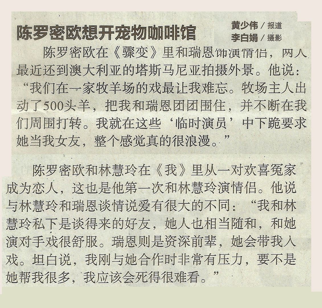 陈罗密欧在《骤å˜ã€‹é‡Œå’Œç‘žæ©é¥°æ¼”æƒ…ä¾£ï¼Œä¸¤äººæœ€è¿‘åˆ°æ¾³å¤§åˆ©äºšæ‹æ‘„å¤–æ™¯ã€‚ä»–è¯´ï¼šâ€œæˆ‘ä»¬åœ¨ä¸€å®¶ç‰§ç¾Šåœºçš„æˆæœ€è®©æˆ‘难忘。牧羊主人出动了500头羊,把我和瑞æ©å›¢å›¢å›´ä½ï¼Œå¹¶ä¸æ–在我们周围打转。我就在这些‘临时演员’ä¸ä¸‹è·ªè¦æ±‚她当我女å‹ï¼Œæ•´ä¸ªæ„Ÿè§‰çœŸçš„很浪漫。â€