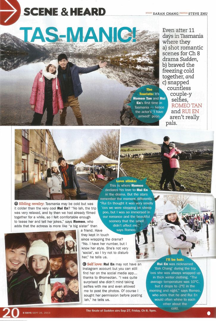Sibling revelry: Tasmania may be cold but was it colder than the very cool Rui En? “No lah, the trip was very relaxed, and by then we had already filmed together for a while, so I felt comfortable enough to tease her and tell her jokes,” says Romeo, who adds that the actress is more like a “big sister” than a friend. Have they kept in touch since wrapping the drama? “No, I have her number, but I know her style. She’s not very ‘social’, so I try not to disturb her,” he tells us.